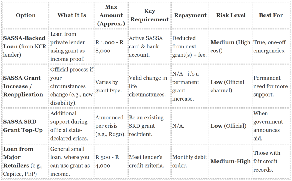 Disclaimer: This article is for informational purposes only and does not constitute financial advice. SASSA-backed loans are expensive forms of credit. Borrow only what you need and are confident you can repay, considering your reduced future grant amount. Consider all alternatives first and seek advice from a registered financial advisor if possible.